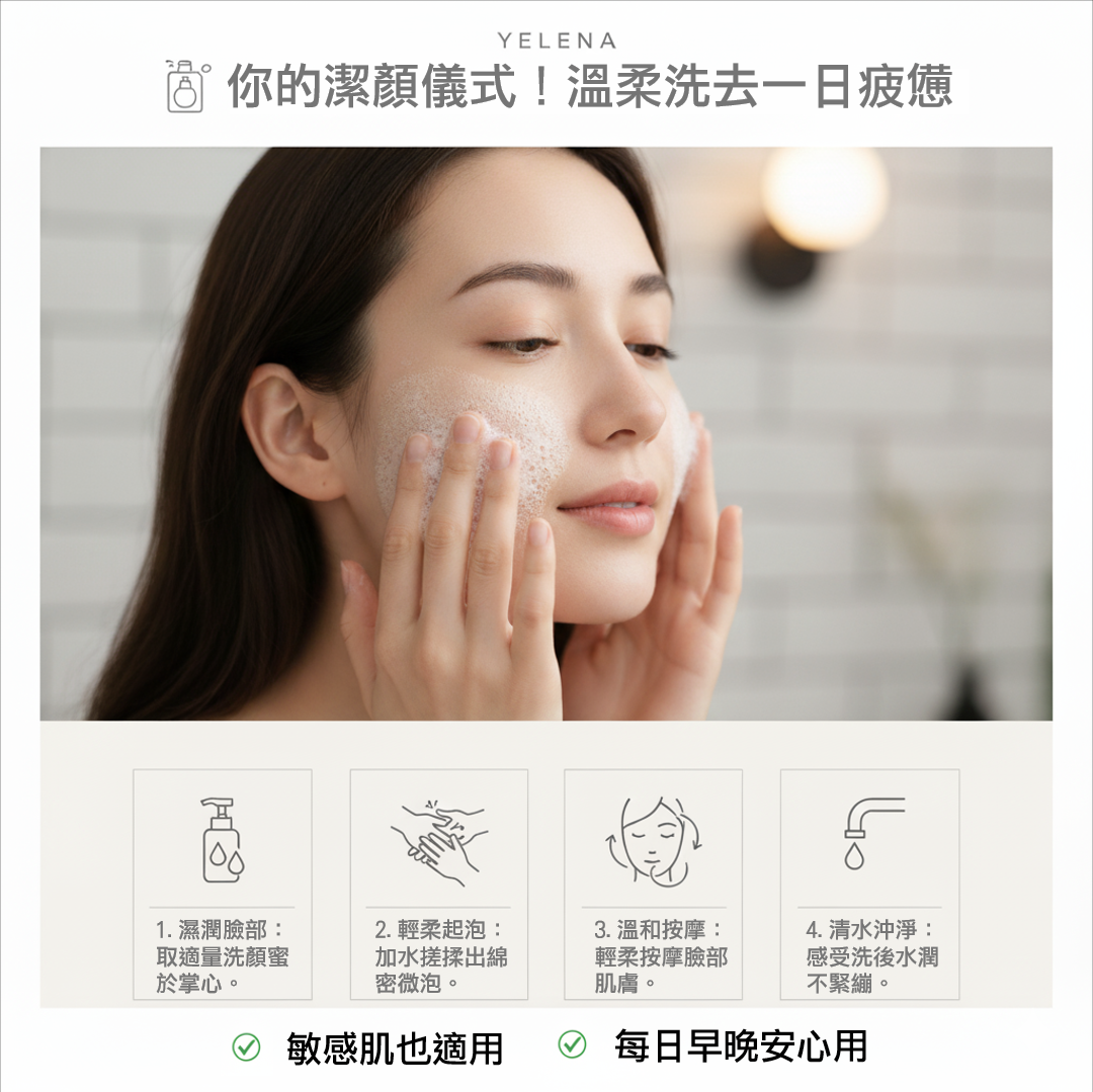 細緻泡沫溫和包覆髒污,適合每日早晚使用,敏感肌也能安心愛用。